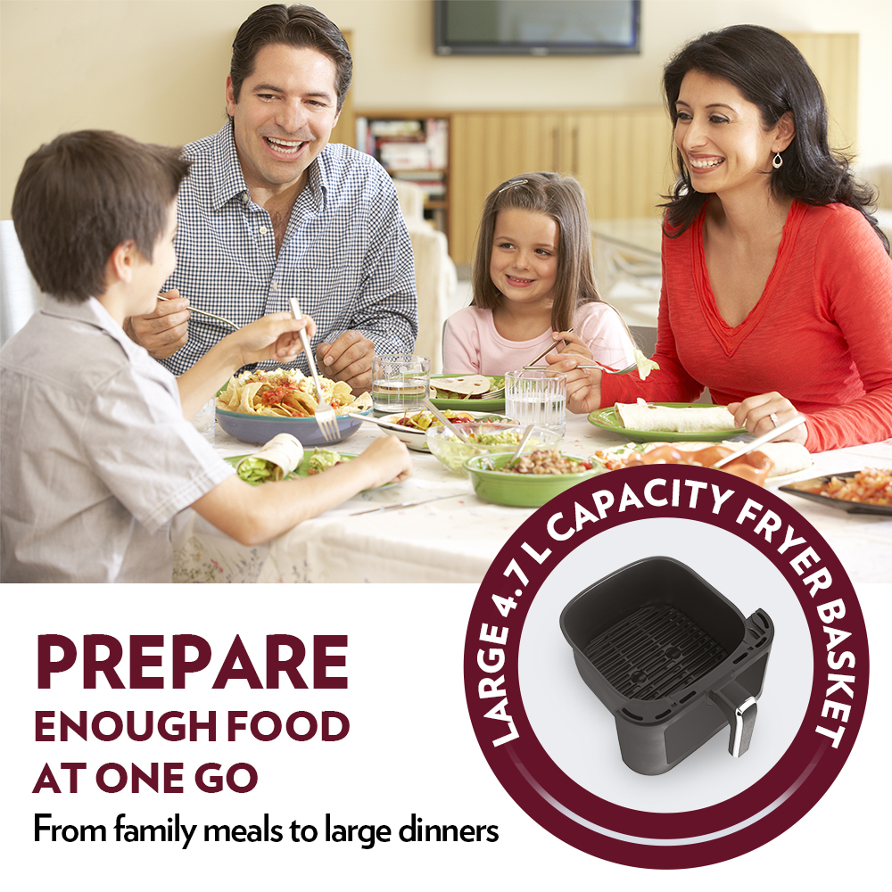 - cooks food using 90% less oil