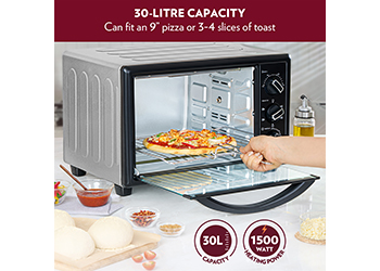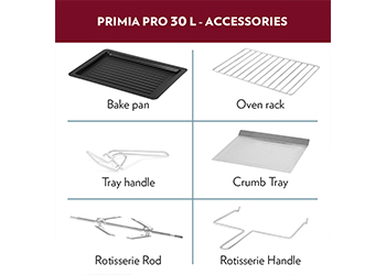 The Prima Pro 30L Oven Toaster Griller is great for baking croissants, cookies cakes, bread, pizzas, muffins, shashliks, bakes – and it can even roast a whole chicken using the rotisserie feature! It comes with all the accessories you need – crumb tray, tray handle (so that you don’t need oven mitts), rotisserie handle, rotisserie axis, rotisserie fork and a recipe book with an array of delicious recipes!
